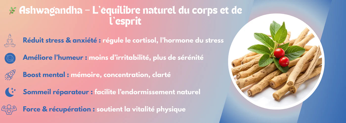 Plante adaptogène puissante qui aide à réduire le stress et régule naturellement le taux de cortisol.