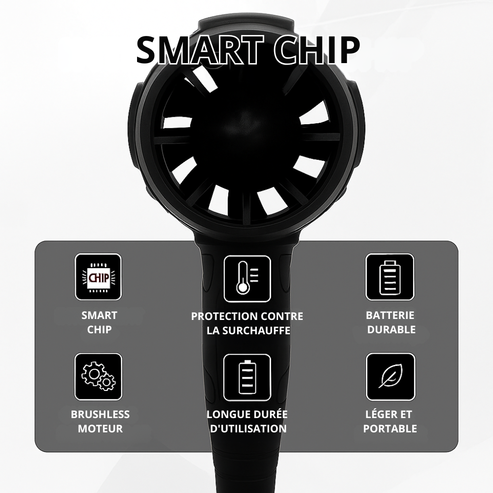 Le VenturaAir™ intègre un système de refroidissement intelligent qui régule automatiquement la température pendant l’utilisation. La puce intelligente intégrée surveille en continu les performances du moteur, empêchant toute surchauffe et prolongeant la durée de vie de l’appareil. Même après une longue utilisation, le flux d’air reste constant et puissant, garantissant une efficacité et une sécurité maximales. Cette technologie avancée vous offre une performance stable et durable, que ce soit à l’intérieur ou à l’extérieur.